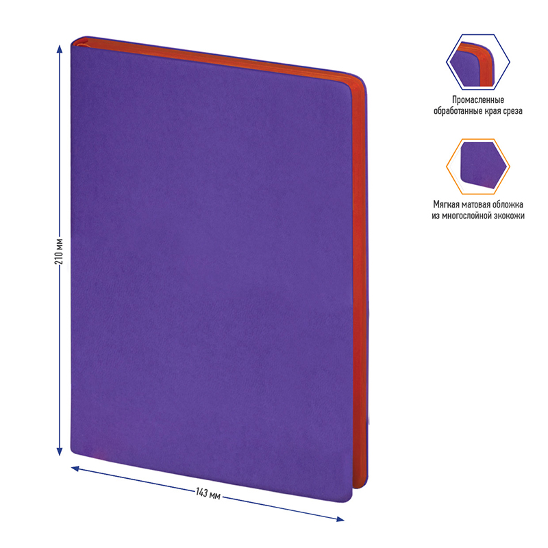 Стильный недатированный ежедневник Berlingo Fuze формата А5 с ультрамягкой обложкой из экокожи. Обложка фиолетового цвета ярко контрастирует с оранжевым срезом. Внутренний блок состоит из 136 листов высококачественной кремовой бумаги повышенной плотности 80 г/м² с пантонной печатью в 2 краски. Недатированный ежедневник Berlingo Fuze представлен в размере 143 на 210 мм. Перфорированные уголки и 2 закладки-ляссе сделают использование ежедневника Berlingo Fuze комфортным. Внутри располагаются отрывные заметки, бланки извещения о ДТП и справочные материалы. Недатированный ежедневник Berlingo подходит под персонализацию. 3 комплекта стикеров станут приятным подарком. • Формат: A5, • Размер: 143*210 мм, • Количество листов: 136, • Материал обложки: экокожа, • Цвет обложки: фиолетовый.