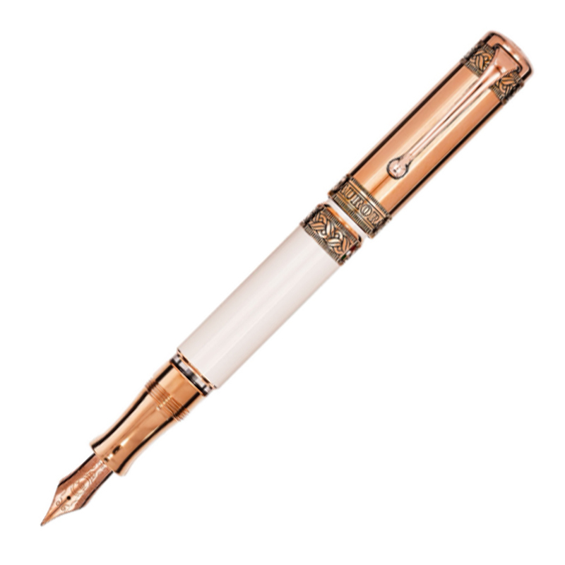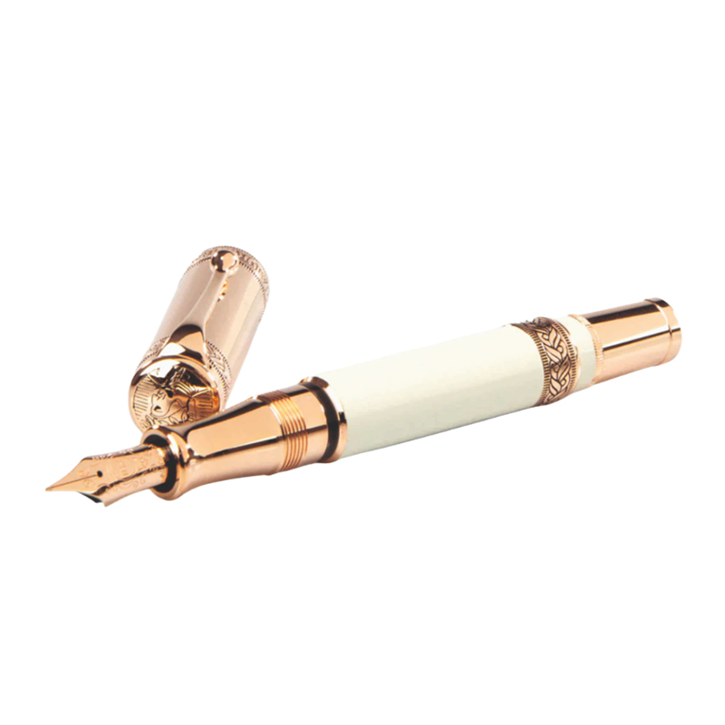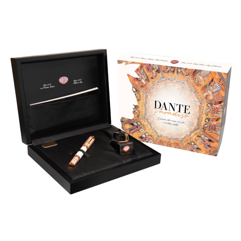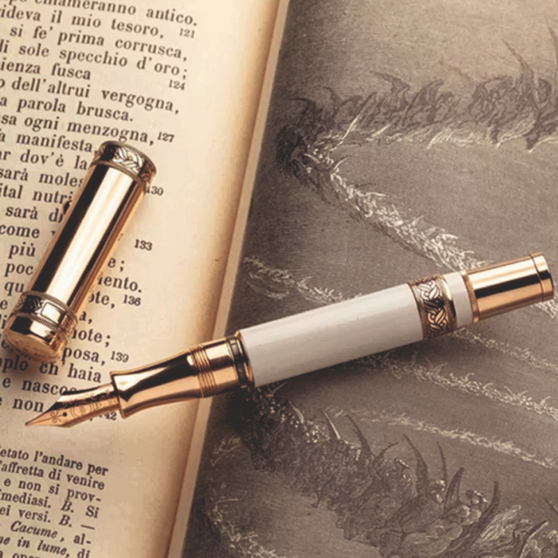 Dante Alighieri - перьевая ручка с пером из цельного золота 18 карат, покрытым розовым золотом. Покрытая розовым золотом зона захвата и металлический колпачок. Корпус с белой лакированной отделкой, покрытая розовым золотом. Перьевая ручка ограниченного выпуска, всего 1265 пронумерованных экземпляров, что соответствует году рождения Данте.